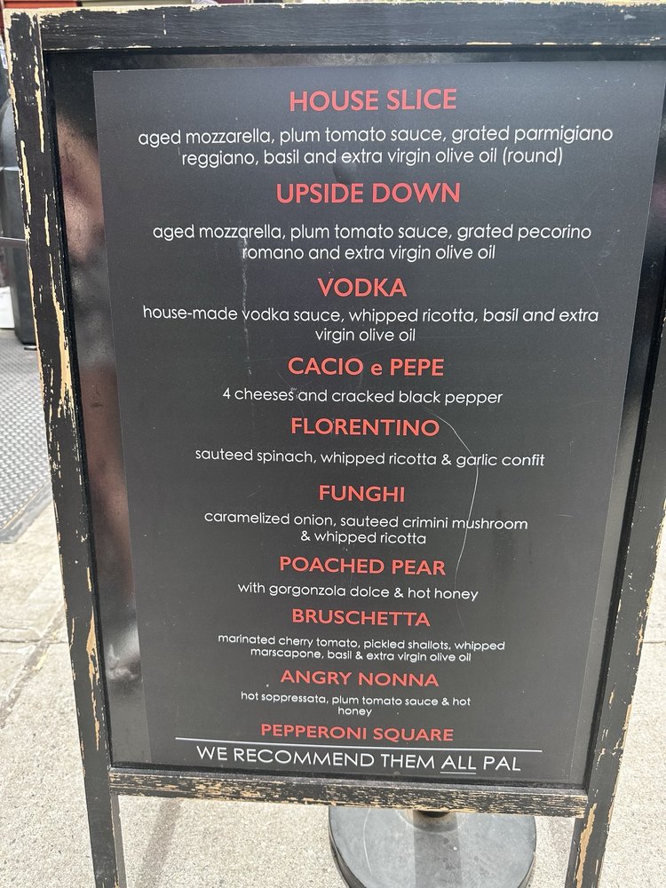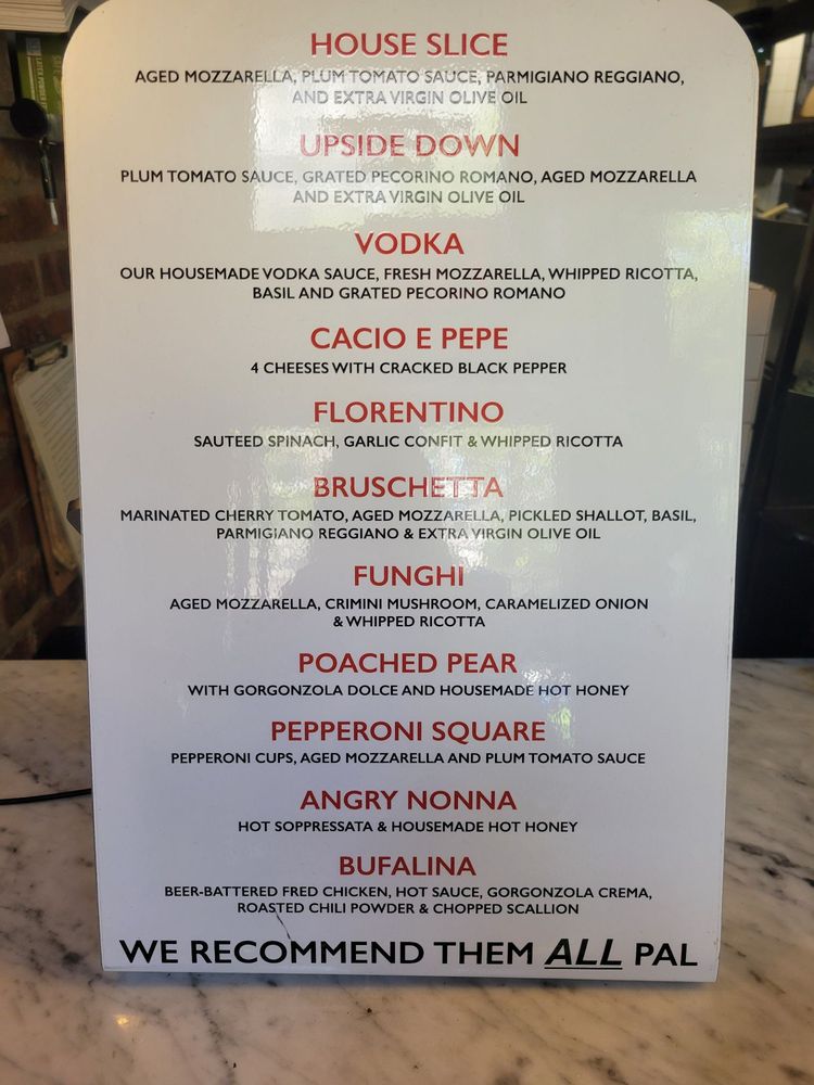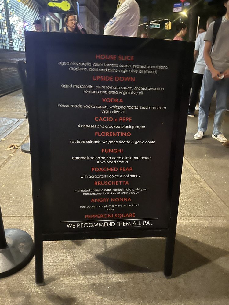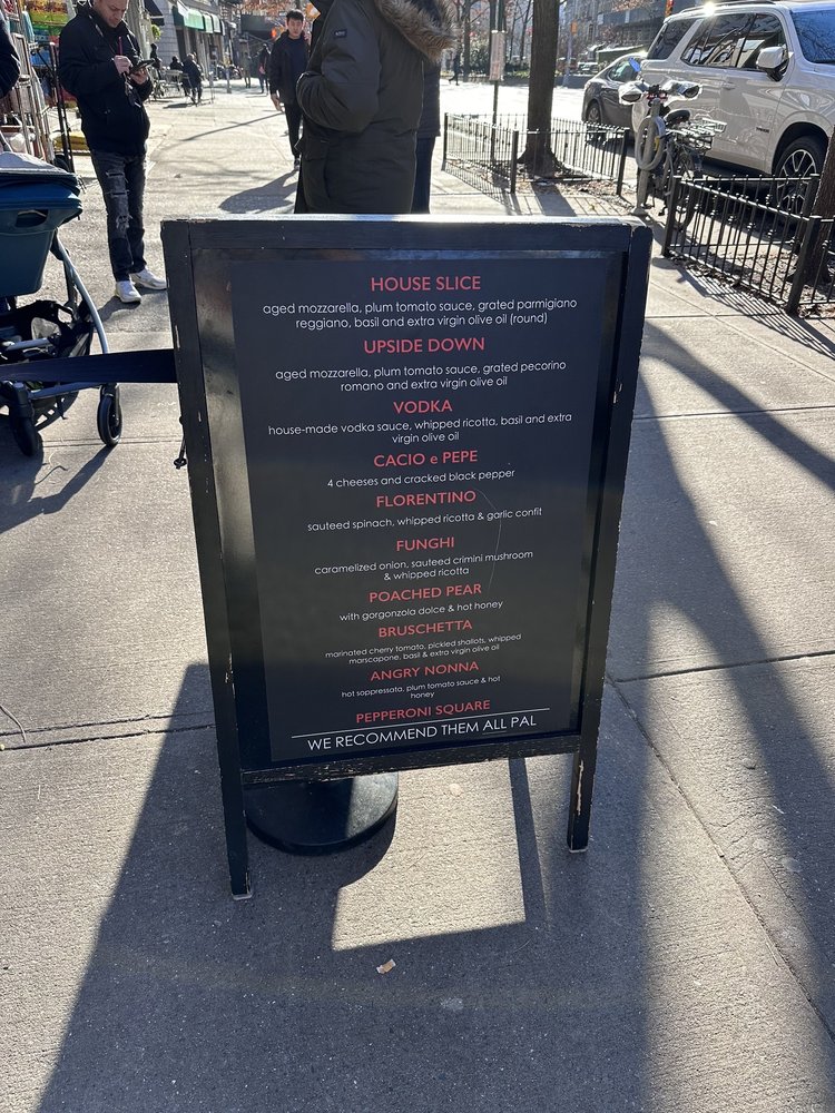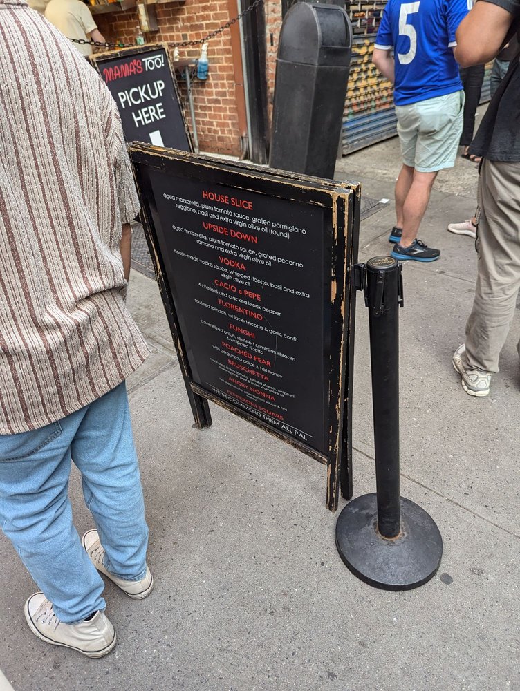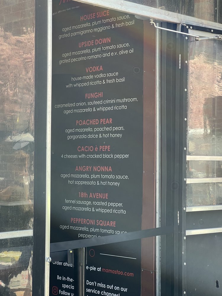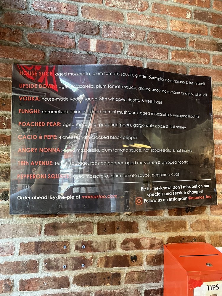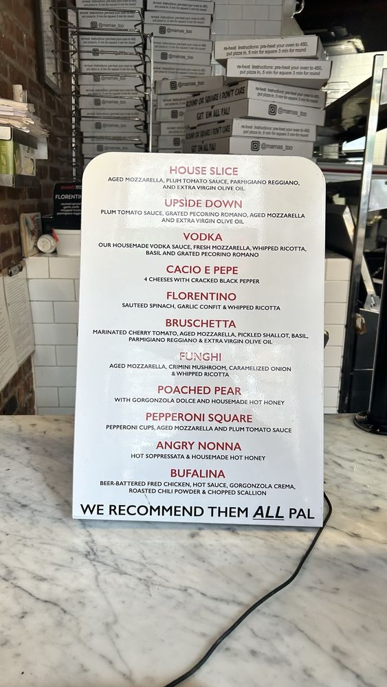 MAMA'S TOO! at 2750 Broadway, New York, NY, offers a variety of delicious pizzas and specialty slices that are worth the visit. The House Pie stands out with aged mozzarella, fresh tomato sauce, and grated parmigiano-reggiano for $19, while the Angry Nonna with sopressata, calabrian chili oil, and hot honey for $27 is a crowd favorite. The crust is perfectly crispy, and the flavors are on point, making each bite a delightful experience. Customers rave about the Cacio e Pepe, Funghi, and Bruschetta slices, highlighting the quality of ingredients and the unique combinations on offer. Although the prices are on the higher side, the taste and portion sizes make it worth it. The casual setting, quick service, and outdoor seating add to the overall dining experience at MAMA'S TOO!